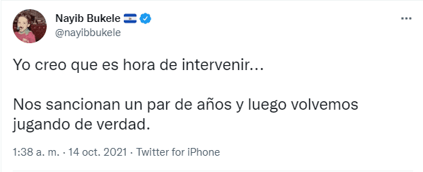 El resultado final y otra nueva actuación decepcionante del conjunto centroamericano hicieron enojar a Nayib Bukele, quien dejó entrever con un enigmático mensaje su disconformidad: “Yo creo que es hora de intervenir… Nos sancionan un par de años y luego volvemos jugando de verdad”.