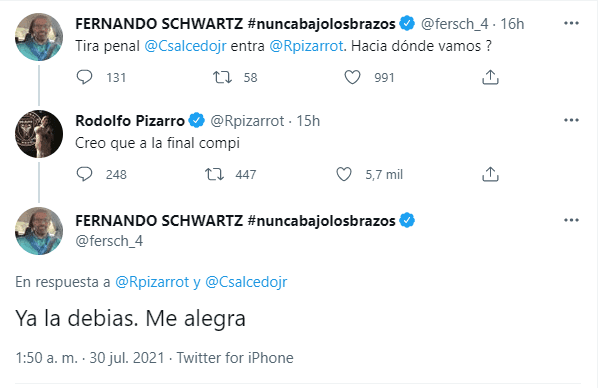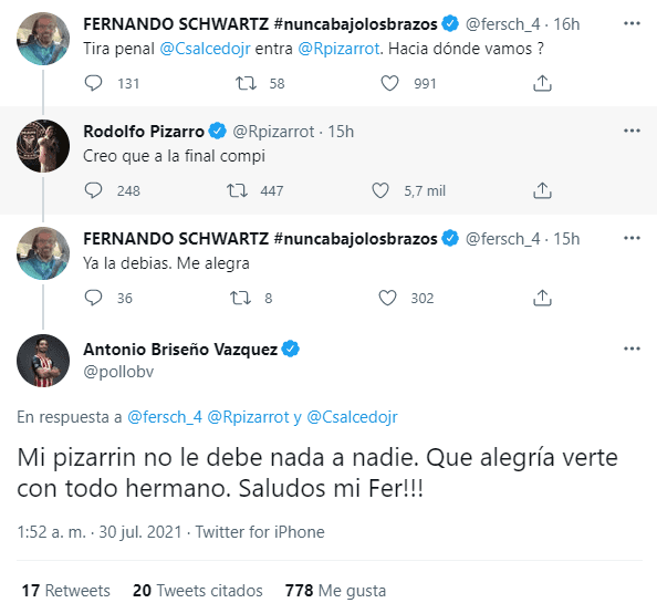 Ante la ofensiva de Pizarro, Schwartz volvió a arremeter en Twitter: “Ya me la debías. Me alegra”. Sin embargo, lo que seguro no esperaba era la intervención de otro futbolista. Fue Antonio Briseño, jugador de El Rebaño,quien salió a defender a su colega: “Mi Pizarrín no le debe nada a nadie. Qué alegría verte con todo, hermano. ¡Saludos, mi Fer!”. ¡Humillación total!