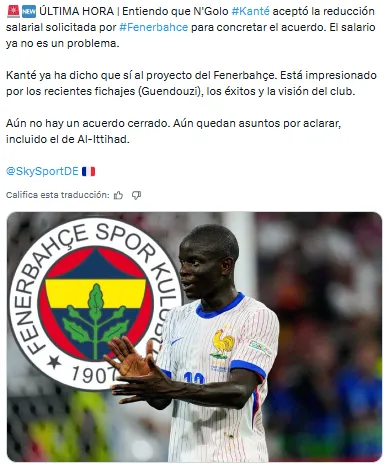 De acuerdo con la información del reportero Florian Plettenberg, N’Golo habría aceptado una reducción en sus salario para poder llegar al Fenerbahçe y el sueldo ya no sería problema. Supuestamente está encantado con lo que le han propuesto en el equipo y aunque no hay un acuerdo cerrado hasta el momento, quedan algunos puntos por tocar con su actual escuadra.