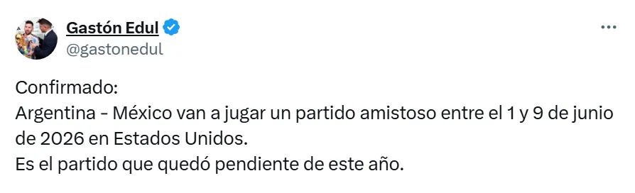 El periodista argentino, Gastón Edul, reveló que entre el 1 y 9 de junio del 2026, antes del comienzo de la competición internacional, México y Argentina jugarán un partido amistoso en Estados Unidos. Este encuentro será el que había quedado pendiente de este año y que finalmente se llevará a cabo en la previa del torneo más esperado.