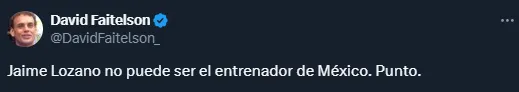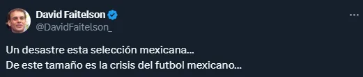 “Jaime Lozano ya no puede ser el entrenador de México. Punto”, escribió Faitelson una vez terminado el juego. Y entre otras cosas, David señaló que esta Selección Mexicana es “un desastre”, como así también que “de este tamaño es la crisis del futbol mexicano”.