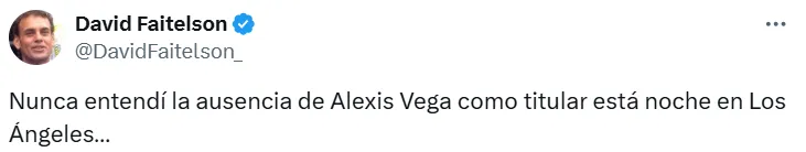 Uno de los que se expresó acerca de lo ocurrido en el SoFi Stadium de Inglewood, California, fue el periodista David Faitelson. Al respecto, el reconocido comunicador pareció enviarle un recado a Javier Aguirre al puntualizar sobrela ausencia de Alexis Vega en el once inicial que jugó frente a los caribeños. “Nunca entendí la ausencia de Alexis Vega como titular esta noche en Los Ángeles…“, puntualizó en su cuenta personal de X (ex Twitter).