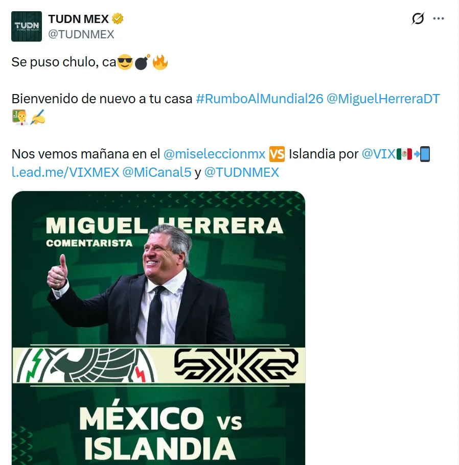 “Bienvenido de nuevo a tu casa”, escribieron en las redes de TUDN. El Piojo regresará al futbol como comentarrista en el partido México vs. Islandia, amistoso internacional que se jugará próximamente. Su experiencia será clave para analizar el juego y aportar su mirada de entrenador con recorrido en selecciones y clubes.