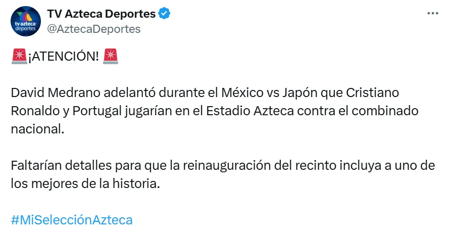 “28 de marzo, señor Martinoli confirmado, la reinauguración de la cancha del Estadio Azteca y faltan mínimos detalles para que se firme a Portugal con todo y Cristiano Ronaldo”, expresó el periodista.