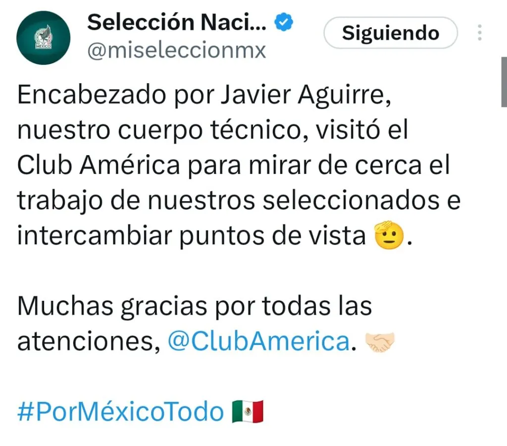 ”Encabezado por Javier Aguirre, nuestro cuerpo técnico, visitó el Club América para mirar de cerca el trabajo de nuestros seleccionados e intercambiar puntos de vista. Muchas gracias por las atenciones, Club América”, escribieron desde la Selección Nacional de México.