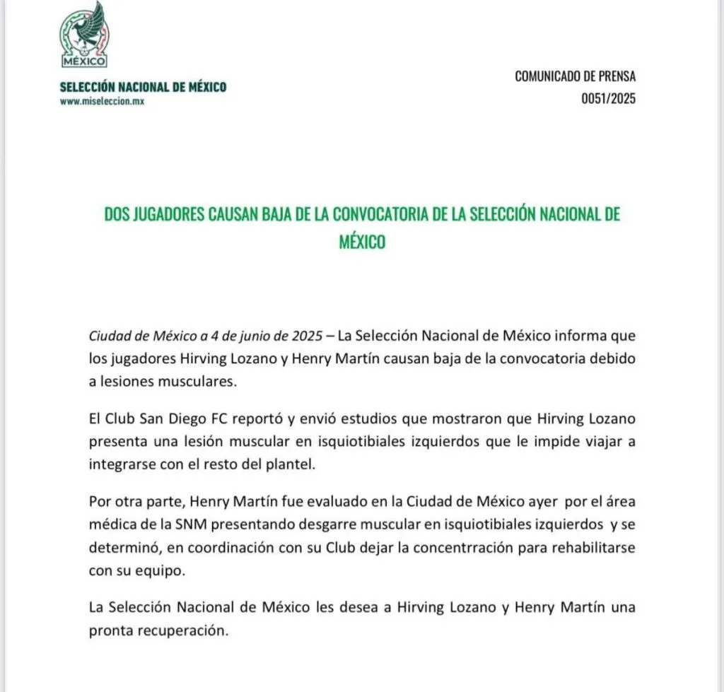 “La Selección Nacional de México informa que los jugadores Hirving Lozano y Henry Martin causan baja de la convocatoria debido a lesiones musculares.