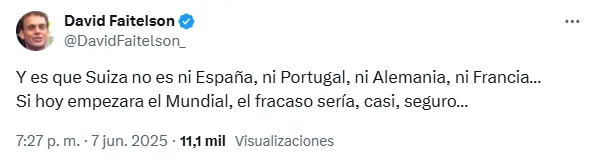“Y es que Suiza no es ni España, ni Portugal, ni Alemania, ni Francia… Si hoy empezara el Mundial, el fracaso sería casi seguro“, agregó el periodista a través de sus redes sociales.
