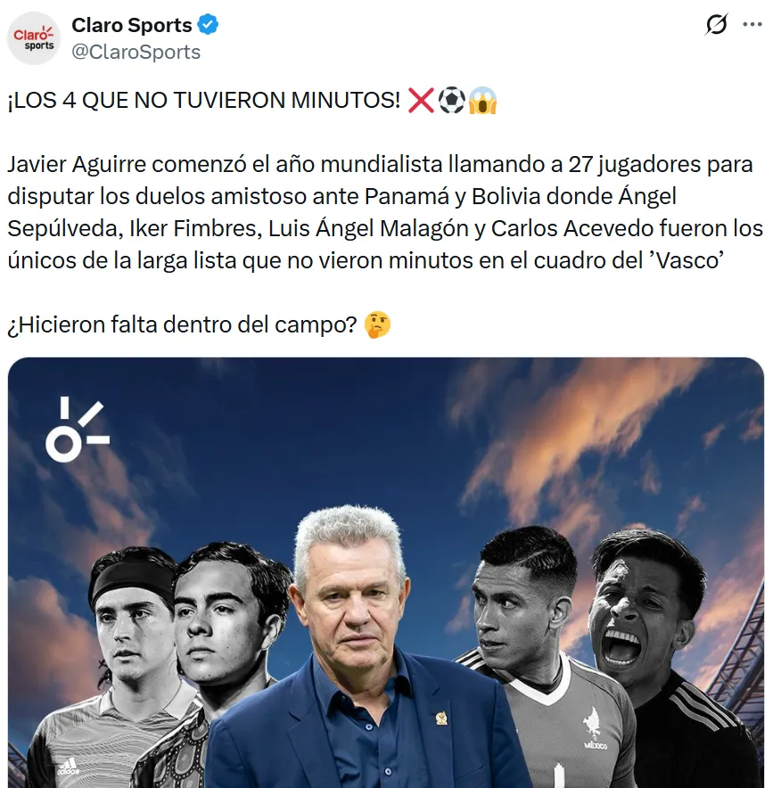 Sin embargo, hubo cuatro de ellos que no jugaron ni un minuto. Se trata de Iker Fimbres, Ángel Sepúlveda, Luis Ángel Malagón y Carlos Acevedo, que vieron ambos encuentros desde el banquillo y no sumaron minutos durante el microciclo.