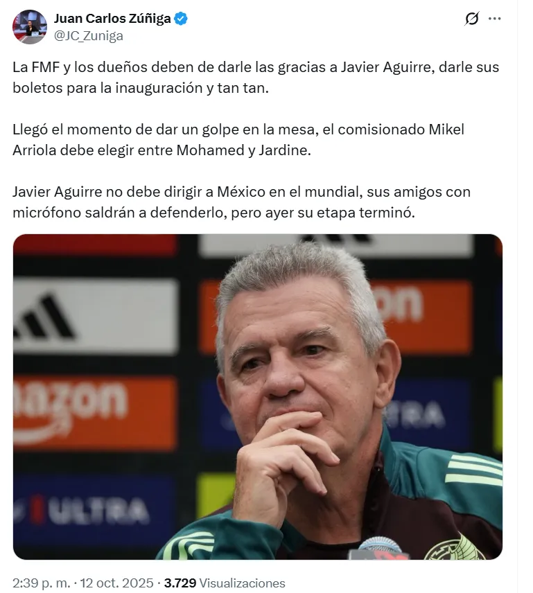 “La FMF y los dueños deben de darle las gracias a Javier Aguirre, darle sus boletos para la inauguración y tan tan. Llegó el momento de dar un golpe en la mesa, el comisionado Mikel Arriola debe elegir entre Mohamed y Jardine”, expresó Zúñiga, encendiendo el debate en redes sociales y en el mundo futbolístico.