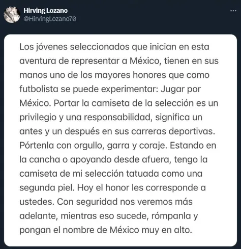 “Los jóvenes seleccionados que inician en esta aventura de representar a México, tienen en sus manos uno de los mayores honores que como futbolista se puede experimentar: jugar por México. Portar la camiseta de la selección es un privilegio y una responsabilidad, significa un antes y un después en sus carreras deportivas”, escribió en X (ex Twitter).
