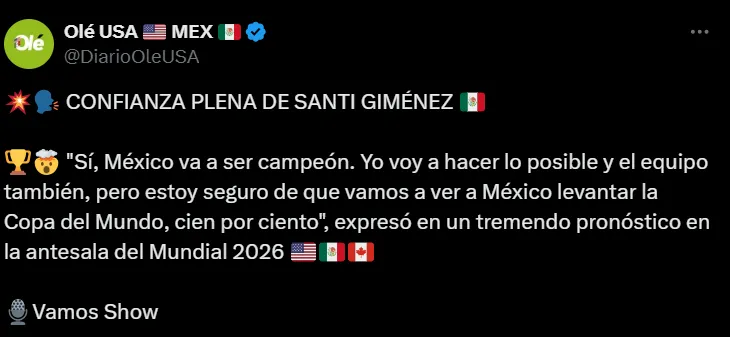 Santiago Giménez, una de las grandes figuras del combinado nacional, no oculta su confianza. El delantero del Milan cree firmemente que se puede lograr la hazaña y, además, aseguró que hará todo lo posible para poder conseguir el título.