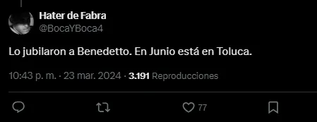 Sin embargo, la ‘irónica’ predicción no es del todo al azar: es que a mediados del año pasado, Benedetto estuvo cerca de ser jugador del Toluca, pero la directiva bajó el fichaje ya que priorizaron otras contrataciones en aquel momento. Y por lo visto, el tiempo les dio la razón.