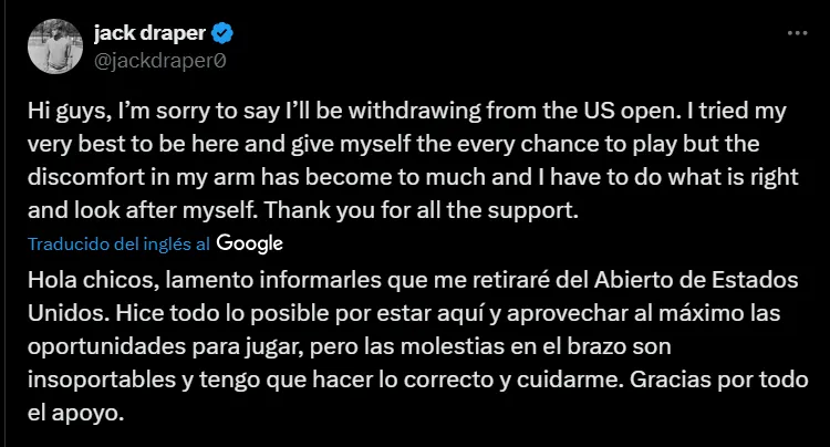 “Hola chicos, lamento informarles que me retiraré del Abierto de Estados Unidos. Hice todo lo posible por estar aquí y aprovechar las oportunidades de jugar, pero las molestias en el brazo son insoportables y tengo que hacer lo correcto y cuidarme. Gracias por todo el apoyo”, expresó Draper en un mensaje publicado en su cuenta oficial de X.