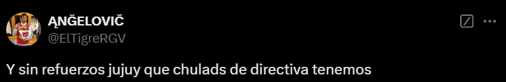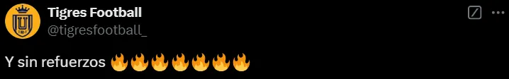 En tanto, quienes se expresaron en redes sociales también apuntaron contra Veljko Paunovic, entrenador de los Universitarios. Hasta el momento, el timonel serbio -que llegó a Nuevo León en junio de este año en reemplazo de Robert Dante Siboldi- no ha logrado enamorar a la parcialidad de Tigres debido a las eliminaciones en la Leagues Cup (octavos de final) y Apertura 2024 (cuartos de final).