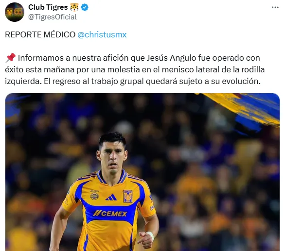 Luego de los estudios pertinentes, Tigres emitió un comunicado: “Informamos a nuestra afición que Jesús Angulo fue operado con éxito por una molestia en el menisco lateral de la rodilla izquierda“, escribió este viernes el club a través de sus redes sociales.