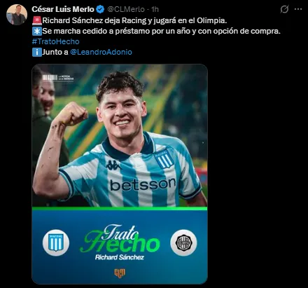- Richard Sánchez jugará cedido a préstamo por un año con el Club Olimpia de Paraguay.
