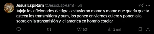 Ante tales circunstancias, la parcialidad felina se animó a exigir un cambio de televisora, por señalar que no es la primera vez que TV Azteca “descuida” a Tigres con distintas medidas. Los fanáticos acusaron que en reiteradas oportunidades, la empresa comercial dejó de lado a los ‘Universitarios’ para priorizar a otros equipos con los que tiene arreglo.