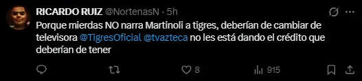 Este viernes, la cadena anunció que Christian Martinoli no relatará el juego vs. Pachuca, y esa publicación acabó por fastidiar a los simpatizantes auriazules. Los usuarios del mundo Tigres tomaron tal decisión como una “falta de respeto” al club no poner a quien consideran el mejor narrador a relatarlos. La señal designó a David Medrano para Tigres-Tuzos y a Martinoli para Puebla-América.