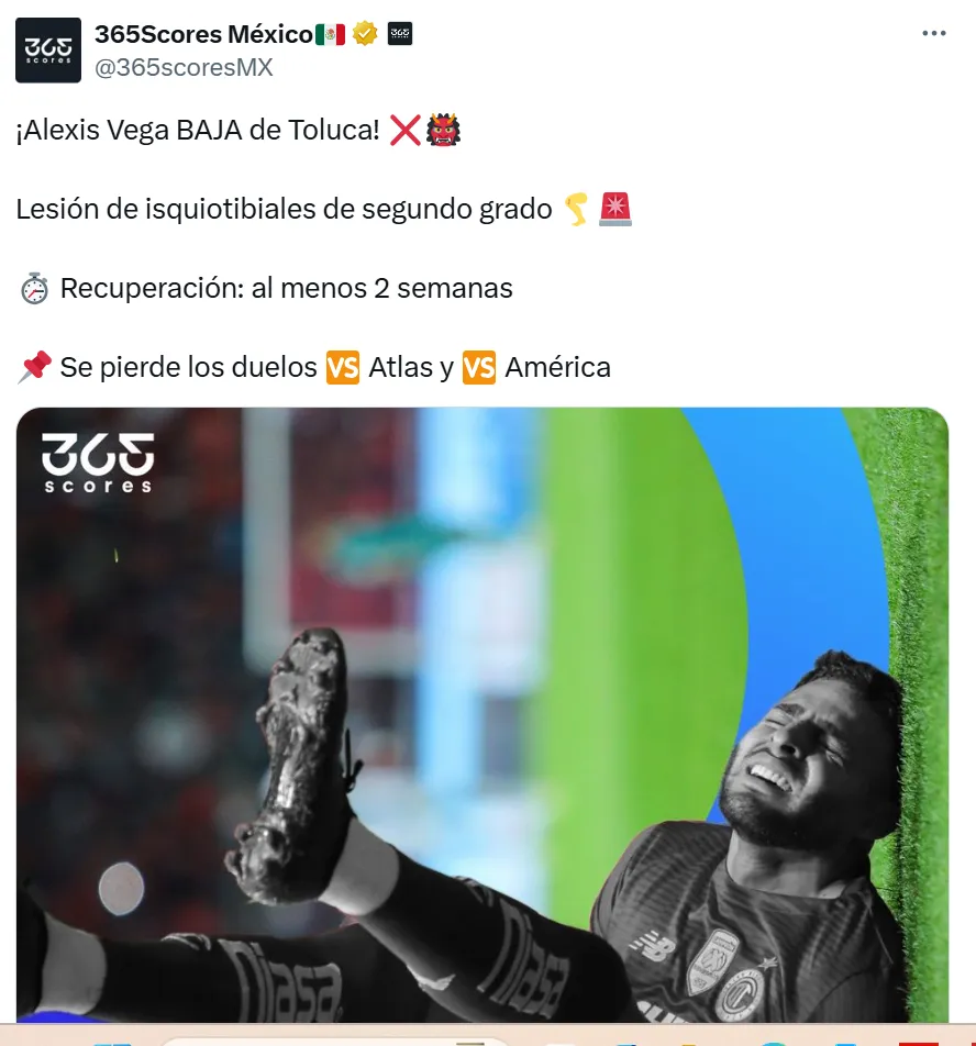 Los resultados fueron lo de menos para Toluca ya que la pésima noticia que recibieron durante el fin de semana fue la lesión de una de sus grandes figuras, Alexis Vega, quién tuvo que salir reemplazado en el último partido por problemas musculares.
