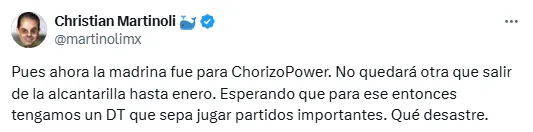 “Pues ahora la madrina fue para ChorizoPower. No quedará otra que salir de la alcantarilla hasta enero. Esperando que para ese entonces tengamos un DT que sepa jugar partidos importantes. Qué desastre“, comentó el periodista de Azteca TV en su cuenta de X (ex Twitter).