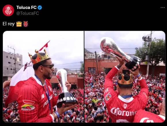 “El rey”, escribió Toluca en sus redes sociales junto a dos fotos de Alexis Vega levantando el trofeo del Clausura 2025 y exhibiéndolo alrededor de todos los aficionados que salieron a las calles a celebrar con el plantel. El futbolista terminó el torneo con números extraordinarios: el delantero convirtió 13 goles y brindó 11 asistencias.
