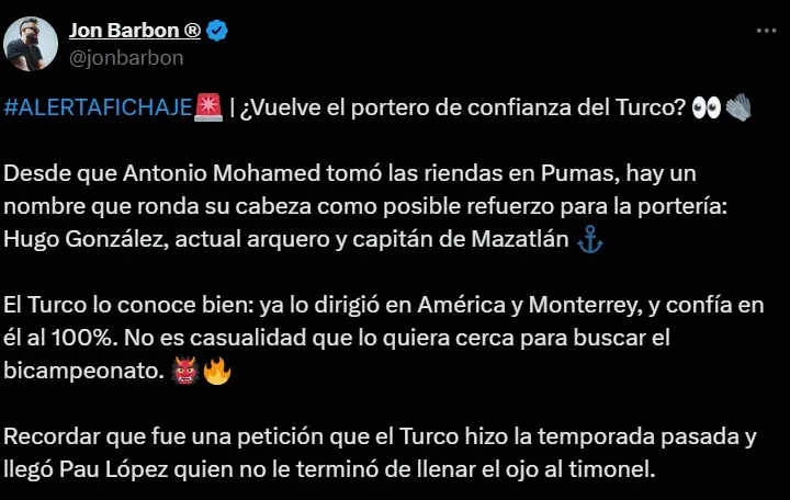 Según reveló el periodista Jon Barbon, el Turco ya tiene a su apuntado. Se trata de Hugo González, actual arquero de Mazatlán. Mohamed lo conoce bien: lo dirigió en Rayados y también lo pidió cuando estuvo en América y en su paso por Pumas UNAM.