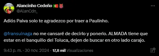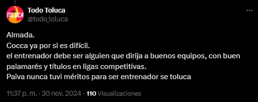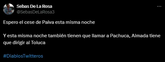 Bajo tal entendimiento, a través de las redes sociales los usuarios que simpatizan por el Toluca se han manifestado con un pedido a las autoridades, que toman las decisiones del área de futbol profesional del conjunto escarlata: en forma unánime, pidieron el nombre de un entrenador para suceder al mencionado Paiva.