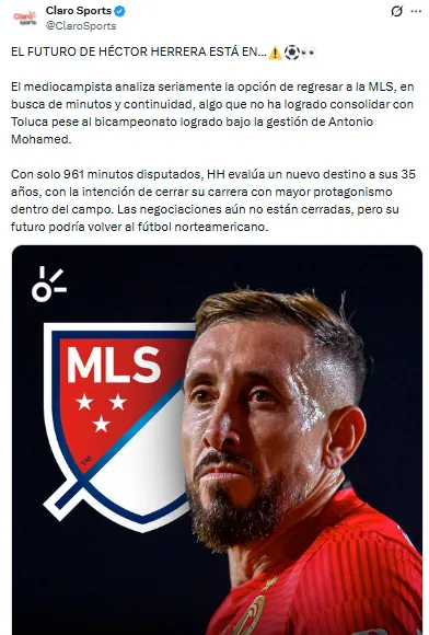 De acuerdo con la información de Claro Sports, Héctor Herrera no se siente satisfecho con lo que está haciendo ahora en el equipo, ya que no suma más de 1000 minutos con la escuadra, es por ello que la idea es que encuentre otra oportunidad en este mercado invernal y tenga la posibilidad de hacerlo de nueva cuenta en la MLS.