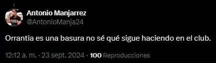 “No sé que sigue haciendo en Toluca”,“No es jugador para este club”, “Paiva no lo puede volver a alinear”, “Nos ha costado muchos goles” y “Tiró a la basura el partido”, fueron algunos de los posteos de los usuarios del Toluca en torno al rendimiento de Carlos Orrantia, que luego de varios encuentros volvió a sumar minutos.