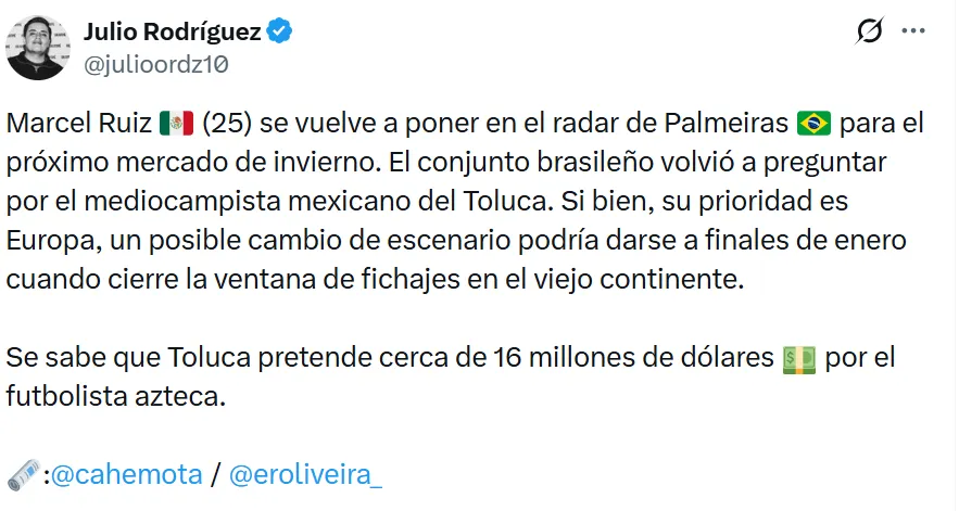 Toluca, consciente del valor de una de sus figuras más importantes, no planea facilitar su salida. El club escarlata ha tasado a Marcel Ruiz en aproximadamente 16 millones de dólares, dejando en claro que cualquier negociación será complicada.