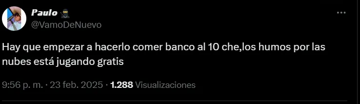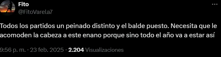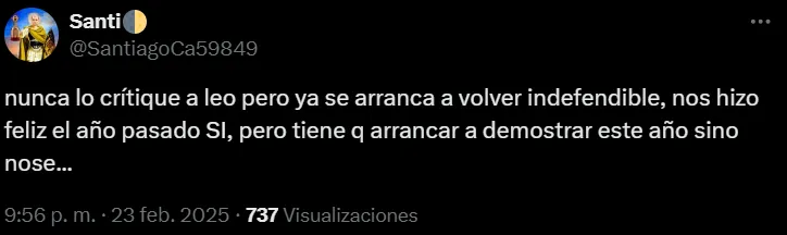 “Todos los partidos un peinado distinto y el balde puesto. Necesita que le acomoden la cabeza a este enano porque sino todo el año va a estar así”, escribió un usuario en X. Otros fueron más duros, como uno que mencionó: “Nunca lo critiqué a Leo, pero ya se arranca a volver indefendible, nos hizo feliz el año pasado, sí, pero tiene que arrancar a demostrar este año, sino no se“. Las redes sociales fueron un hervidero de comentarios negativos hacia el mediocampista.