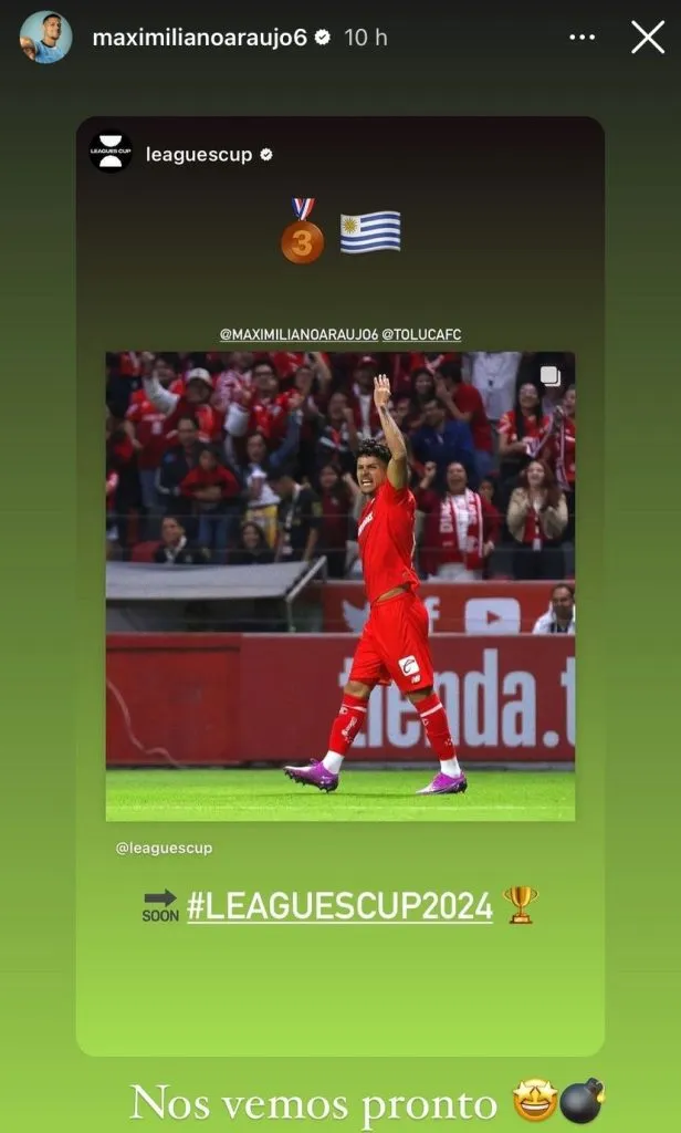 Es que dentro de sus ‘stories’ de Instagram, el charrúa reposteó una historia de la cuenta de Leagues Cup, que había subido una foto de recuerdo de la última participación de Araujo. Junto a ello, Maxi escribió “Nos vemos pronto”, como asegurando que estará presente en quince días, cuando Toluca haga su debut.