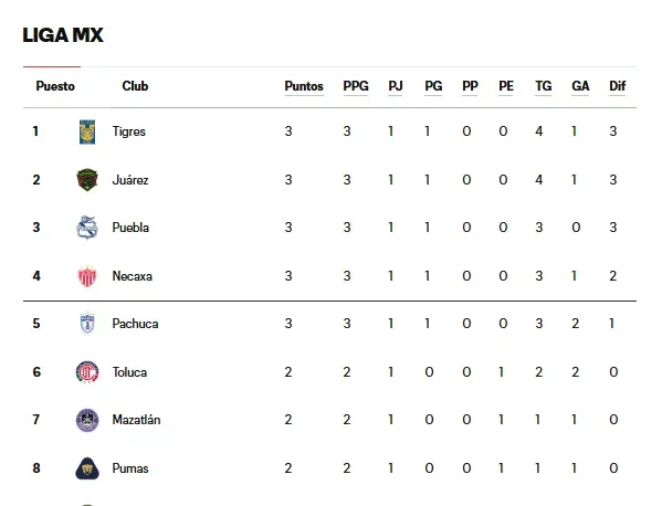 La tabla de posiciones de la zona de Liga MX en Leagues Cup: