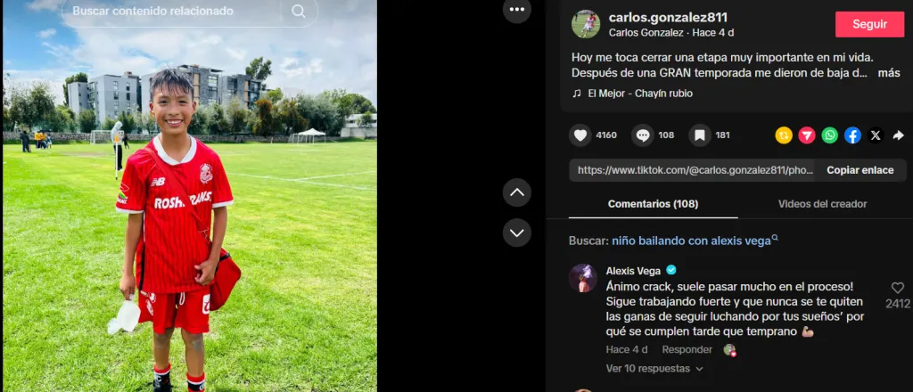 Recibiendo el cariño de la afición, es ahora el propio jugador quien lanzó un mensaje a un joven jugador de las fuerzas básicas del cuadro rojo. Esto se dio un posteo de TikTok, donde el joven jugador Carlos González, siendo solo un niño, se despidió del club tras ser cortado en las fuerzas básicas.