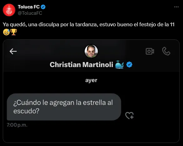 “Ya quedó, una disculpa por la tardanza, estuvo bueno el festejo de la 11”, escribió Toluca al compartir el mensaje de Christian Martinoli al club. El reportero ya había participado en otra cuestión tras el título de los Diablos al ‘bautizar’ al Nemesio Díez como el ‘Nemesio Once’.