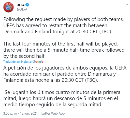 “A petición de los jugadores de ambos equipos, la UEFA ha acordado reiniciar el partido entre Dinamarca y Finlandia esta noche a las 20:30 CET (hora local). Se jugarán los últimos cuatro minutos de la primera mitad, luego habrá un descanso de 5 minutos en el medio tiempo seguido de la segunda mitad”, informó el organismo rector del futbol europeo.