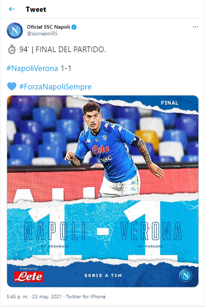 Por la última jornada de la temporada 2020-21 de la Serie A, Napoli recibió a Hellas Verona en el Estadio Diego Armando Maradona. Los equipos no se sacaron ventajas e igualaron 1-1.Amir Rrahmani abrió el marcador para los locales; mientras que Davide Faraoni igualó las cosas para el cuadro de visita.