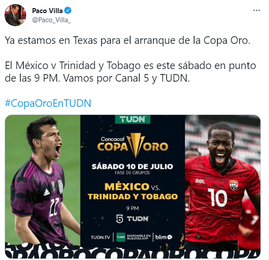 Muchos aficionados tenían la esperanza de escuchar en la Gran Final de la Euro a quien se ha convertido en uno de sus narradores favoritos enla televisión mexicana: Paco Villa, sin embargo, el propio relator descartósu participación en esta transmisión, debido a que estará a cargo del debut de la Selección mexicana frente a Trinidad y Tobago en la Copa Oro, desde Texas,este sábadoa las 21:00 horas, tiempo del centro de México.