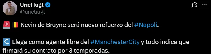 Incluso, desde dentro del club partenopeo le abren cada vez más las puertas a esta posibilidad. En ese sentido, nada menos que Aurelio de Laurentiis, presidente de Napoli, reveló que De Bruyne ya habría comprado una casa en la ciudad. “Sé que ha adelantado algunas cosas, incluso creo que ya se ha comprado una hermosa casa. Esta mañana he conectado por video con él, su mujer e hijo de nueve años. Ha sido una imagen preciosa”, manifestó.