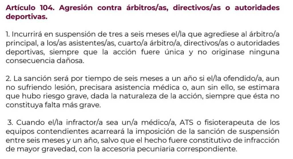 Bajo tales circunstancias, el reglamento español señala que su suspensión dependerá del informe final del colegiado: si no tiene un agregado extra, será suspendido de tres a seis meses (según el punto 1 del artículo 104 del Código Disciplinario); en cambio, si el juez consideró el hecho una “falta grave”, será suspendido de seis meses a un año (de acuerdo al punto 2).