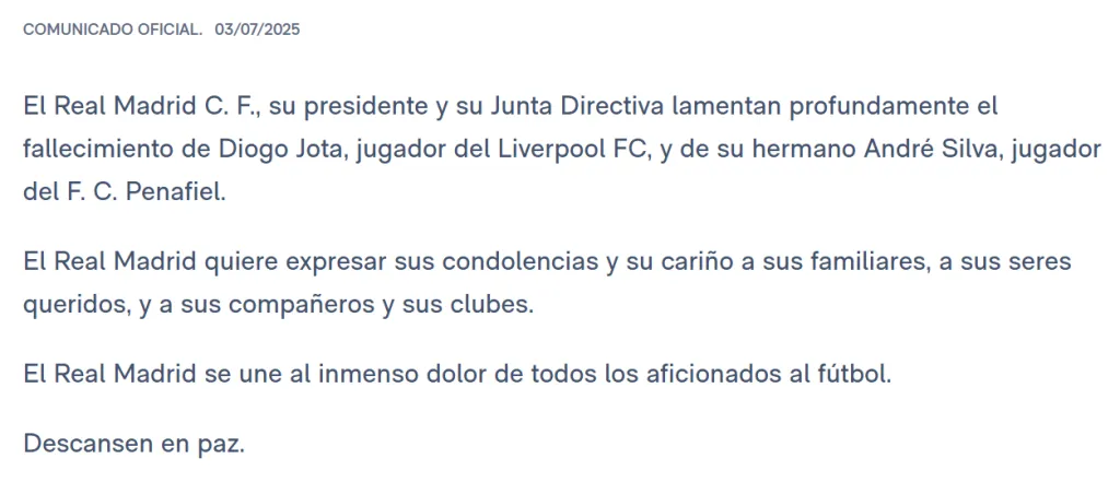 “El Real Madrid C. F., su presidente y su Junta Directiva lamentan profundamente el fallecimiento de Diogo Jota, jugador del Liverpool FC, y de su hermano André Silva, jugador del F. C. Penafiel.