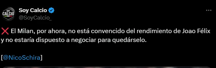 Según el periodista Nicolò Schira, la situación de Joao Félix en el Milan está cada vez más complicada. Los directivos del club no están convencidos con el rendimiento mostrado por el jugador y, por el momento, no tienen intenciones de activar la cláusula de 35 millones de euros para su compra definitiva. A pesar de su potencial, el futbolista no ha logrado encontrar su lugar en el esquema de Conceição, y su futuro en el Milan parece estar en duda.
