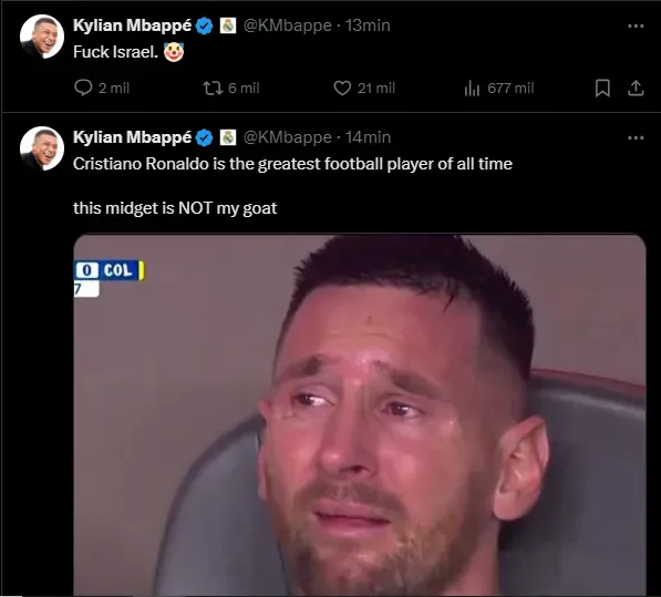 En este caso, la cuenta de ‘X’ de Kylian Mbappé fue hackeada y se realizaron varios posteros que no tienen nada que ver con el jugador francés. Una serie de publicaciones que puede ofender a ciertos grupos. Se desconoce quien burló la seguridad de la cuenta y no existen motivo alguno.