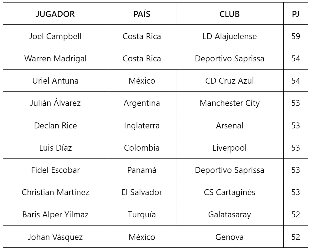 Los datos fueron extraídos de Transfermarkt, correspondientes únicamente al lapso de la temporada 2023/24 entre todas las competiciones del mundo, y reconociendo no solamente los partidos disputados con el equipo de turno sino también en los que defendieron a la Selección de su país.