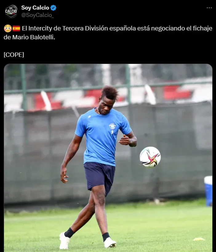 El fichaje sería solamente por una temporada, con opción a extender un año más, y se trataría de la primera experiencia en España en la carrera de Balotelli. Ahora bien, un dato no menor es que Intercity es el primer club que se cotiza en bolsa y las acciones subieron un 15% ante los rumores de la llegada de Mario.