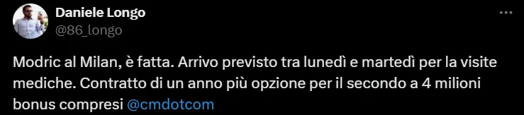 Según informó el periodista Daniele Longo, la próxima semana Modric llegará a Italia para realizarse la revisión médica y luego firmar un contrato por una temporada con el equipo Rossonero, con opción a extenderlo por un año más si es que lo desea.