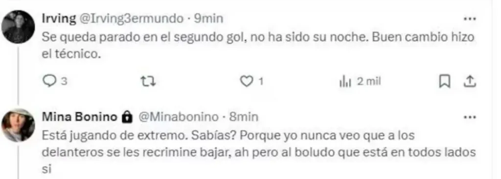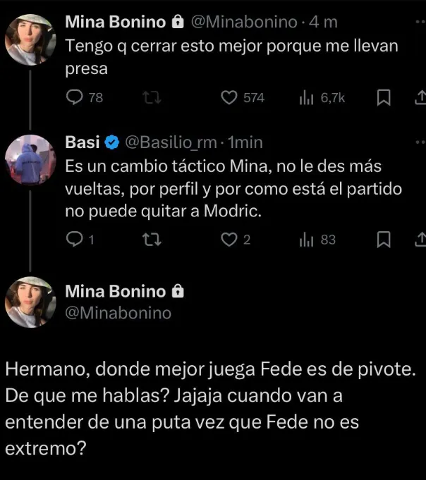 “Hermano, donde mejor juega Fede es de Pivote. ¿De qué me hablas? Jajaja, ¿cuándo van a entender de una puta vez que Fede no es extremo?”, replicó. Más tarde, cuando alguien le señaló que el uruguayo había fallado en el segundo gol del Milan, agregó: “Está jugando de extremo. ¿Sabías? Porque yo nunca veo que a los delanteros se les recrimine no bajar, pero al boludo que está en todos lados sí”.