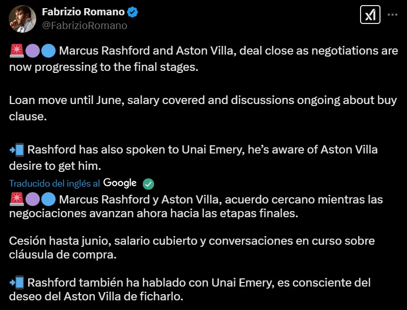 Tal como informó Fabrizio Romano, ahora el equipo mejor posicionado para hacerse con los servicios de Marcus Rashford es Aston Villa. Los Villanos vendieron al colombiano Jhon Durán a Al-Nassr y están a detalles de conseguir una cesión hasta junio con una posible cláusula de compra.