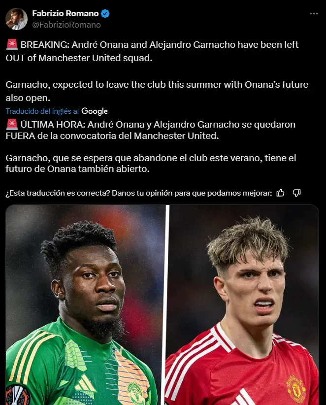 Una de las decisiones fuertes fue la ratificación del entrenador Ruben Amorim en el cargo a pesar de los malos resultados. Sin embargo, hay importantes jugadores que abandonarán la plantilla. Uno de ellos es Alejandro Garnacho, quien se mostró muy enojado por su poco protagonismo la final de la UEL y no será tomado en cuenta por el DT portugués. No obstante, ahora se confirmó que otra estrella también es transferible.