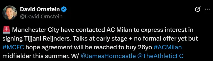 Se trata del neerlandés Tijjani Reijnders, mediocampista central por el cual la institución inglesa ya se habría contactado para expresarle a los italianos su interés en el futbolista, tal como lo informó el periodista David Ornstein. Al respecto, el comunicador reveló que las pláticas aún están en una etapa inicial y que no hay ofertas formales hasta el momento. Sin embargo, Manchester City tendría esperanzas de poder contratar al jugador de 26 años.